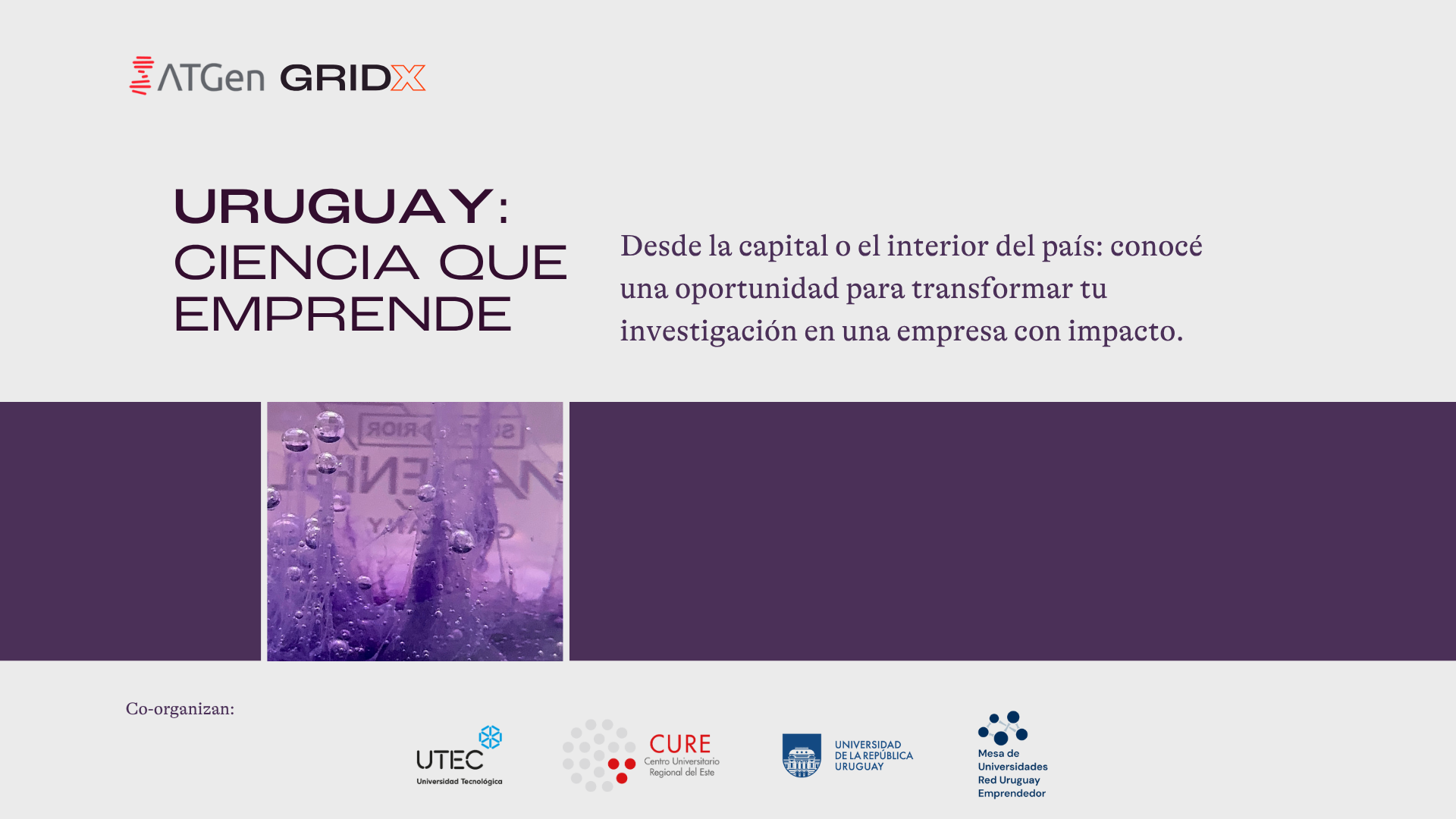 GRIDX, en colaboración con la Universidad Tecnológica (UTEC), el Centro Universitario Regional del Este (CURE - Udelar) y la Mesa de Universidades de la Red Uruguay Emprendedor, invita al evento virtual "Uruguay: ciencia que emprende", el jueves 7 de agosto a las 11 h para conocer cómo emprender desde la ciencia y la academia.